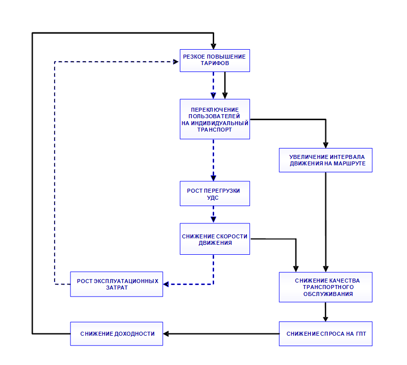 Как видно из схемы, если повышение тарифов вызывает значительное переключение пассажиров с общественного транспорта на личный, то это приводит к росту интенсивности транспортных потоков, которое вызывает снижение их скорости и повышение эксплуатационных затрат транспортных предприятий (на схеме – сплошная линия). Кроме того, снижение пассажиропотока может привести к увеличению интервала движения на маршрутах общественного пассажирского транспорта, что делает общественный транспорт менее привлекательным и снова приводит к снижению спроса (пунктирная линия). Как повышение затрат, так и снижение доходности затем ведут к необходимости снова повысить тарифы.