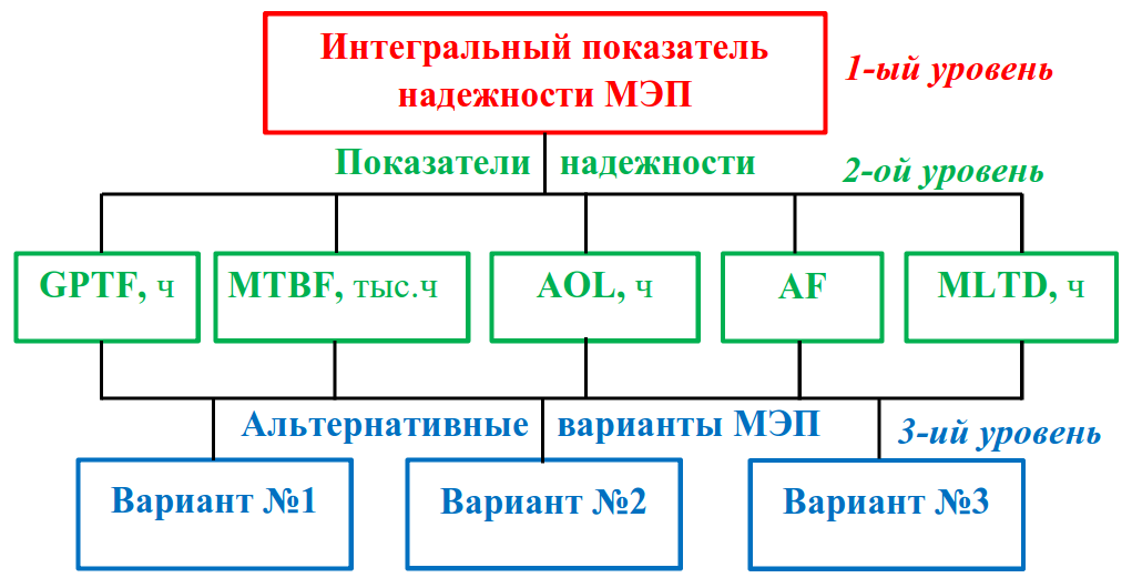 В наиболее элементарном виде иерархия состоит из вершины (условно здесь находится общая цель – формирование ИПН), от которой идут промежуточные уровни, состоящие из пяти критериев (показателей надежности), уточняющих цель, к нижнему уровню, состоящему из 3 альтернативных вариантов МЭП.