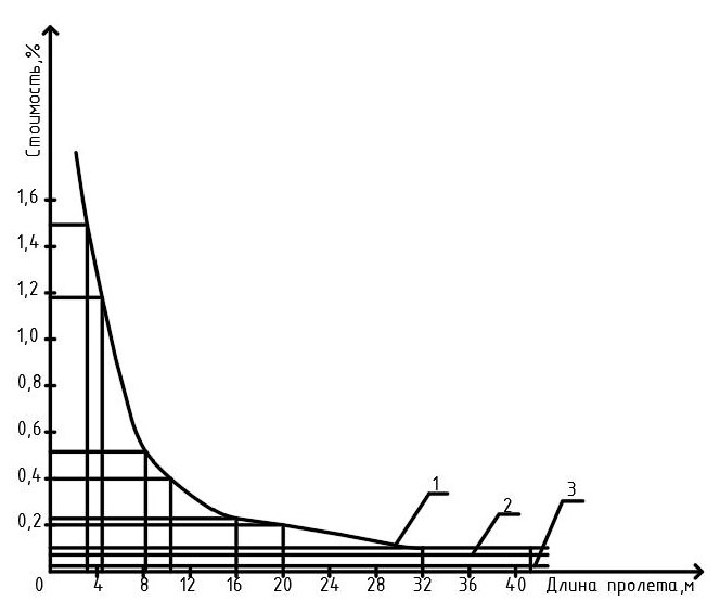 В основу определения объемов работ положены три основные характеристики моста: L – длина, В – ширина, F – площадь поверхности несущих конструкций. Все остальные объемы ремонтных работ определялись в виде процентного отношения этих трех показателей. Процент назначался, исходя из статистической обработки наличия и объемов тех или иных дефектов около 1500 обследованных мостов. Объемы работ определялись для различных габаритов и длин пролетов. На основе подсчетов получены зависимости объемов основных работ от длин и габаритов.