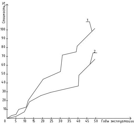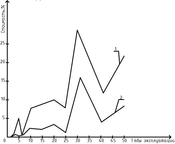 На основании этих зависимостей построены графики изменения объемов и стоимости ремонтных работ для каждого года службы моста. При этом исходная стоимость сооружения принималась равной 400 руб. площади проезжей части, а стоимость ремонтных работ по калькуляциям эксплуатационных организаций. На Рис. 1 приведены графики стоимости ремонта деформационных швов, гидроизоляции и покрытия проезжей части автодорожных мостов, отнесенной к полной стоимости сооружения [7]. При этом затраты на содержание и ремонтно-профилактические мероприятия не являются постоянными во времени (Рис. 2). Суммарные эксплуатационные расходы нарастают скачкообразно (Рис. 3) по мере накопления повреждений, выхода из строя и замены отдельных элементов и конструкций моста (замена балок с каркасной арматурой через 30 лет эксплуатации, с преднапряженной – 50 лет, металлических пролетных строений – 60 лет и др.) [8–11]. Из Рис. 3 видно, что к 50–60 годам службы эксплуатационные расходы составляют 60–100 % от стоимости строительства нового моста. Причем чем меньше величина пролетов моста, тем целесообразнее ограничение его срока службы [12–15].