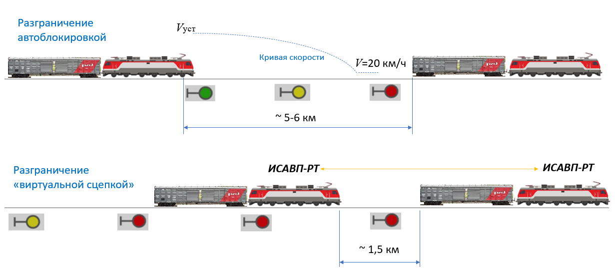 При вождении поездов по технологии «Виртуальная сцепка» между локомотивами по радиоканалу устанавливается соединение, осуществляется непрерывный обмен данными между локомотивами. Ведомый локомотив, идущий в попутном следовании, обрабатывая информацию с впереди идущего локомотива (ведущий) выбирает наиболее оптимальный режим работы. Модернизированная Унифицированная система автоматизированного ведения поездов (УСАВП) с установленной системой ИСАВП-РТ-М ведомого поезда, основываясь на информации, поступающей от ведущего поезда, производит расчет момента изменения сигнала огня локомотивного светофора с «желтого» на «зеленый» или с «красно-желтого» на «желтый», тем самым соблюдая наименьшее безопасное расстояние между ведущим и ведомым поездами с расчетом эффективности работы системы торможения.