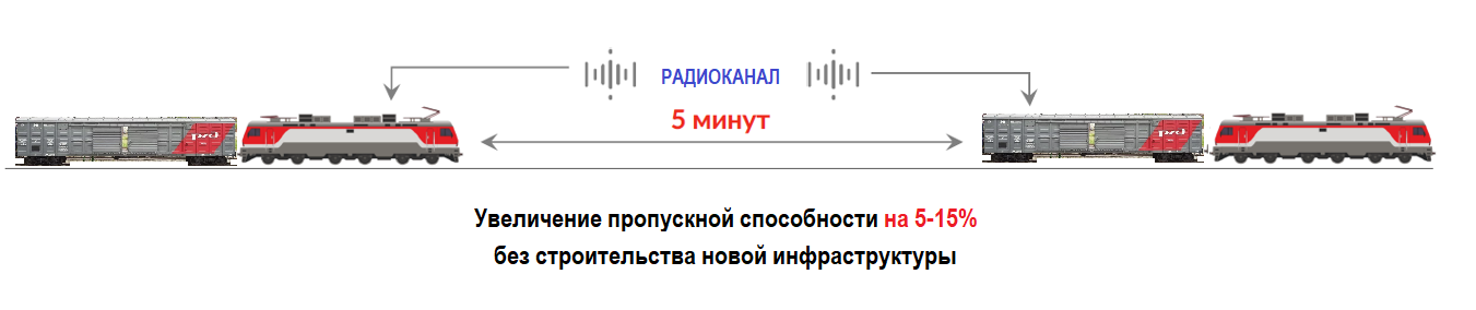 Для решения задачи сокращения межпоездных интервалов ООО «АВП Технология» разработало и серийно производит Интеллектуальные системы автоматического ведения поезда с распределенной тягой (ИСАВП-РТ-М), реализующие вождение грузовых поездов по технологии «Виртуальная сцепка». Сокращение межпоездного интервала происходит за счет обеспечения непрерывного обмена информацией по радиоканалу между локомотивами и оценки режимов движения впереди идущего поезда системой ИСАВП-РТ-М (Рис. 2).