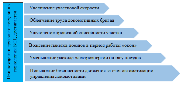 Система обеспечивает наименьшее безопасное расстояние между грузовыми поездами в попутном следовании, непрерывно производит оценку эффективности систем торможения для обеспечения постоянной готовности произвести безопасную остановку грузового поезда. Также наблюдаются и другие положительные эффекты внедрения технологии ВСЦ (Рис. 4).