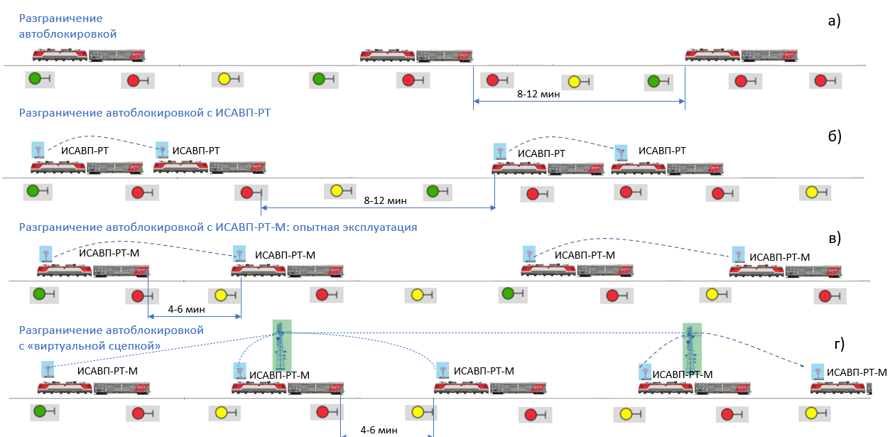 Рис. 2. Сокращение межпоездного интервала при использовании системы ИСАВП-РТ-М