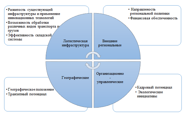 Все факторы можно разделить на 4 группы: внешние региональные, организационно-управленческие, логистические и географические. Однако не все факторы в равной степени оказывают влияние на формирование инновационной инфраструктуры ТЛК.