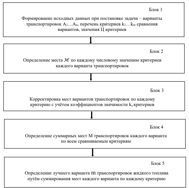 Блок 2 – определяются места M каждого варианта по числовому значению каждого критерия. При этом место  тем выше (лучше для перевозочного процесса), чем больше числовое значение Ц соответствующего критерия. Данные размещены в Табл. 2.