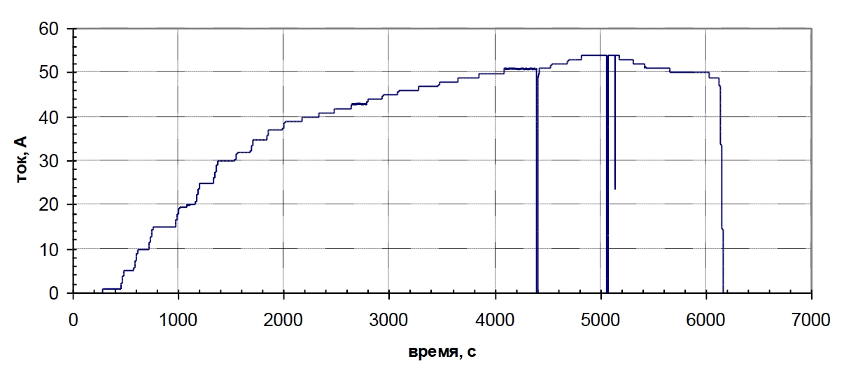 График, представленный на рис. 13, описывает заведение тока в систему. Подъем тока первоначально осуществлялся на 5 А, далее на 2 А. Для затухания индуктивной составляющей напряжения выдерживалась «полочка», равная 1 минуте. Подъем тока осуществлялся до возникновения активной составляющей напряжения, которая, как видно из графика, появилась на 4000 с при токе 50 А.