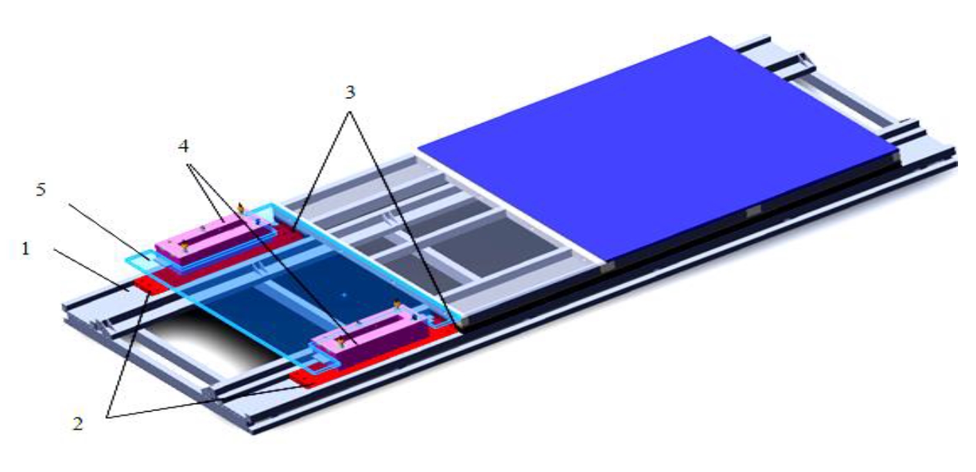 Рис. 15. Модель демонстрационно-испытательного стенда статической левитации: поз. 1 – платформа; поз. 2 – постоянные магниты, расположенные на путевой структуре; поз. 3 – постоянные магниты, расположенные на платформе; поз. 4 – компактный ВТСП модуль; поз. 5 – груз