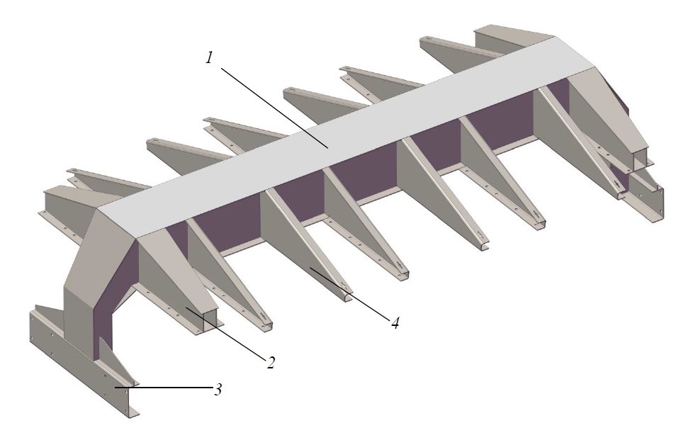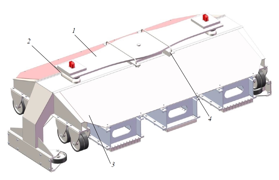 Рис. 1. Рама опытного образца магнитолевитационной тележки: 1 – основная несущая балка прямоугольного сечения; 2 – продольные балки для маневровых колес; 3 – продольные балки для направляющих колес; 4 – кронштейны для креплении блоков с магнитами