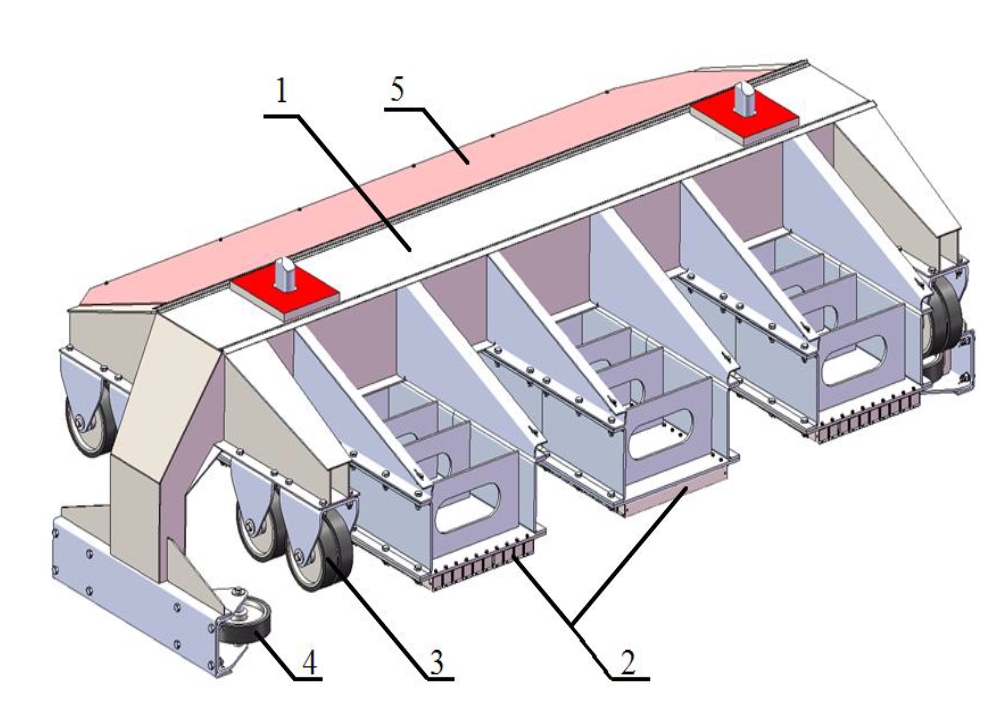 Рис. 2. Общий вид опытного образца магнитолевитационной тележки: 1 – рама; 2 – блоки с магнитами; 3 – маневровые колеса; 4 – направляющие колеса; 5 – защитный кожух