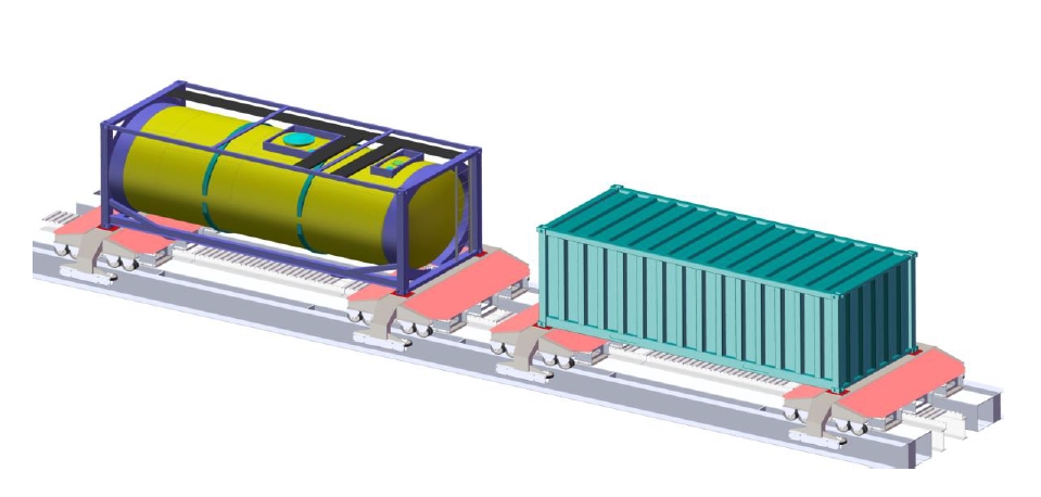 Тележки предназначены для перевозки контейнеров различных типов (рис. 4), при этом не требуется дополнительных устройств для соединения тележек между собой.