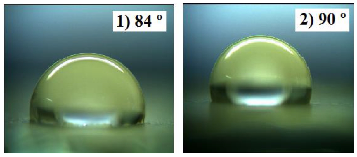 Рис. 1. Фотография капли воды и величина краевого угла смачивания на гидрофобном покрытии 2 и близком к гидрофобному 1