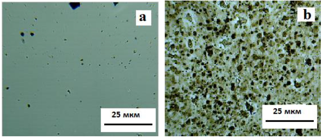 Рис. 2. Микрофотографии покрытий: a – из золя № 2, модифицированного соединением 2; b – из золя № 6, модифицированного соединением 2 и аэросилом R-972