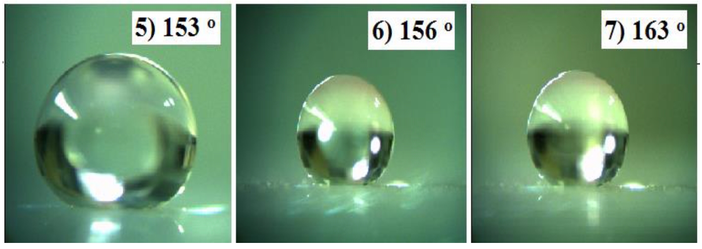 Особый рельеф поверхности покрытия, сформированный с помощью текстурирующего наполнителя аэросил R-972, который к тому же имеет поверхностные гидрофобные метильные группы, позволило увеличить значение краевого угла смачивания свыше 150° (см. в табл. № 5–8, рис. 2, 3). Наибольший эффект достигается при одновременном использовании фторсодержащего компонента (табл., образцы № 5–7).