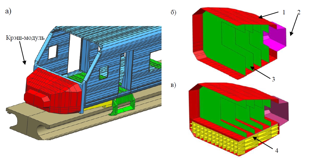 Столкновение поезда на магнитной подушке с другим крупногабаритным объектом, например, деревом, крупным животным или другим транспортным средством придется на торцевую часть головного вагона. Негативные последствия такого столкновения способен уменьшить крэш-модуль, установленный на передние стойки остова кузова, как показано на рис. 2-а. В статье рассмотрено два варианта исполнения крэш-модуля: первый, состоящий из исключительно тонкостенной стальной конструкции (рис. 2-б), а второй – с добавлением ячеистой структуры (рис. 2-в). Конструкция УПЭ состоит из корпуса 1, переднего блока 2, воспринимающего на начальном этапе нагрузку аварийного столкновения, диафрагм 3, обеспечивающих стабильное деформирование крэш-модуля и ячеистых структур 4, повышающих энергоемкость устройства.