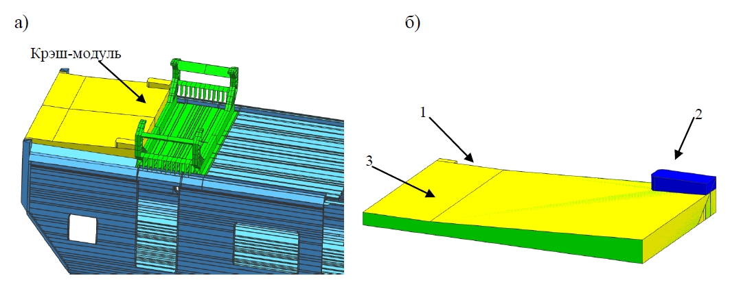 Если объекты столкновения по размеру малые, но имеют значительный вес, например камни, то они могут проникнуть через зазор между транспортным средством и путевой структурой и при высокой скорости движения могут пробить пол или повредить подвагонное оборудование. Для такого случая предлагается использовать крэш-модуль, расположенный под вагоном, как показано на рис. 3-а. Разработанный крэш-модуль аналогичен УПЭ, установленному в поезде «Трансрапид» [7]; он состоит из корпуса (1), выполненного из алюминиевых листов, путеочистителя (2) и энергопоглощающего материала (3). В отличие от типового крэш-модуля, используемого в подвижном составе поезда «Трансрапид», энергопоглощающий материал выполнен не из алюминиевой сотовой конструкции, а из вспененного алюминия. Такой материал обладает высокой удельной прочностью и эффективно поглощает энергию удара.