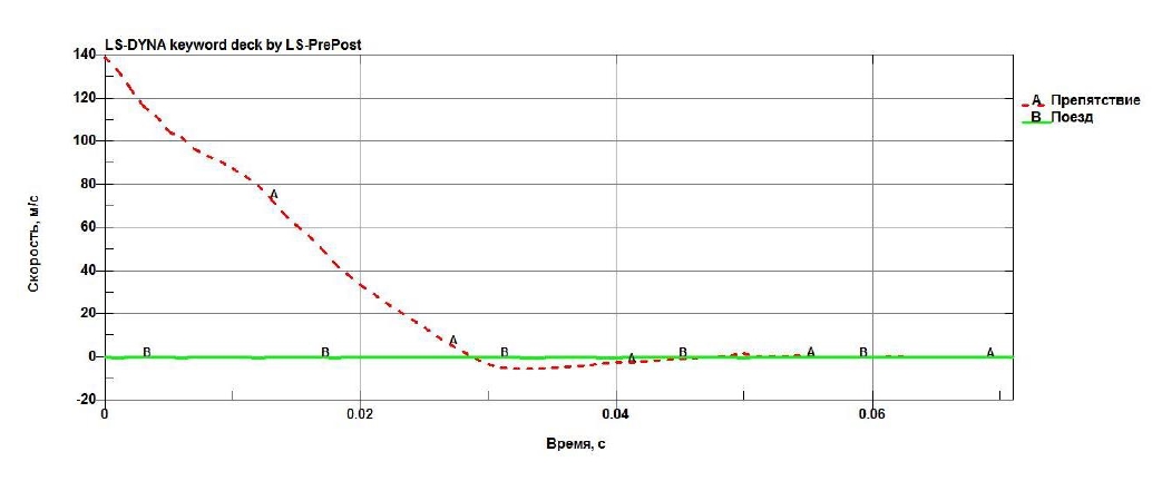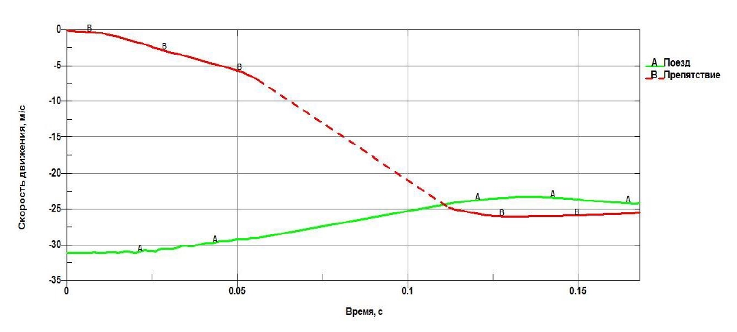 Рис. 7. Диаграмма изменения скорости движения поезда и препятствия для первого исполнения крэш-модуля