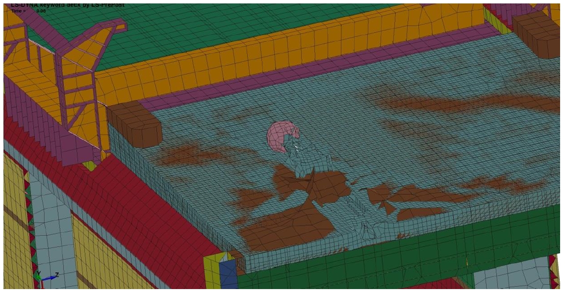 На взаимодействующих поверхностях модели задавались условия контакта: граничные условия на поверхностях накладывают ограничения на скорость движения и напряженное состояние контактных точек. Для реализации данного условия в программе LS-DYNA был использован специальный контактный алгоритм, который автоматически определяет контактные поверхности.