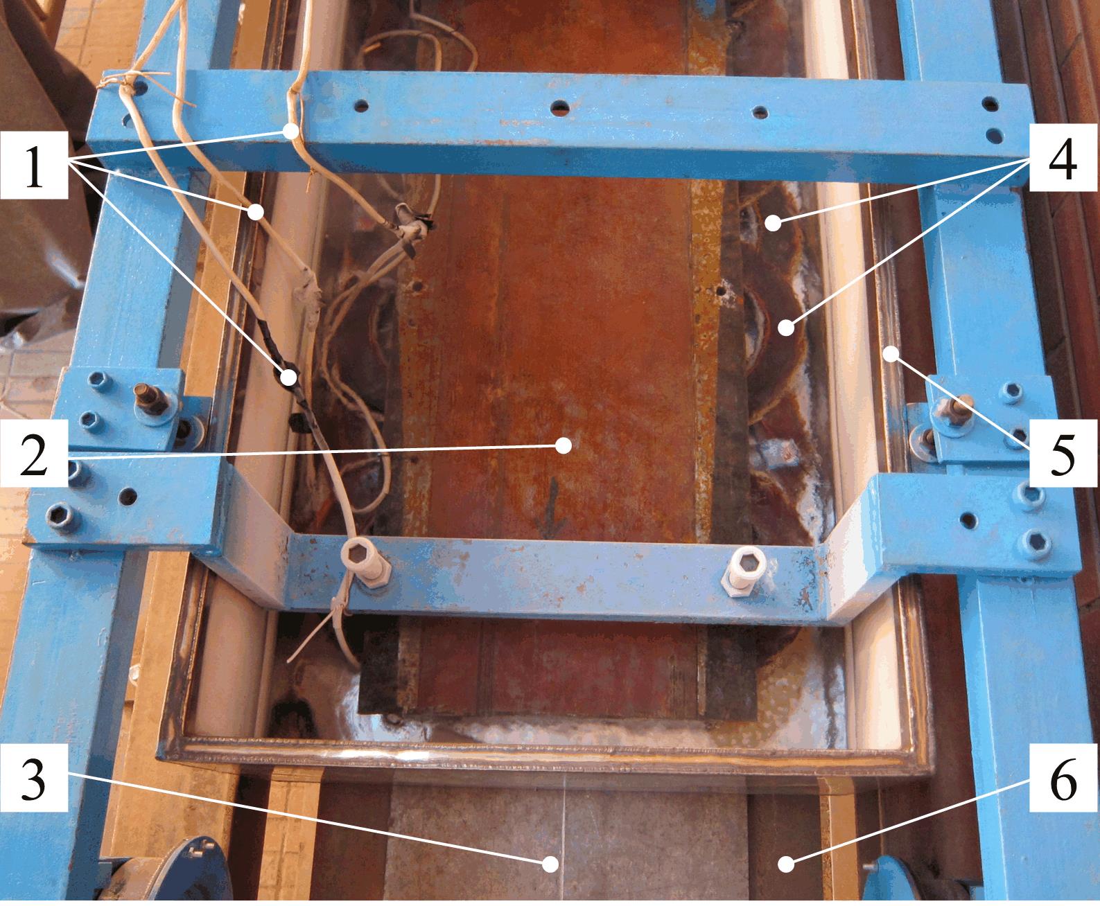 Fig. 26. HTS linear induction motor aimed to linear metro (1-power supply, 2-core, 3-aluminum plate, 4-HTS coils, 5-Dewar, 6-iron plate)