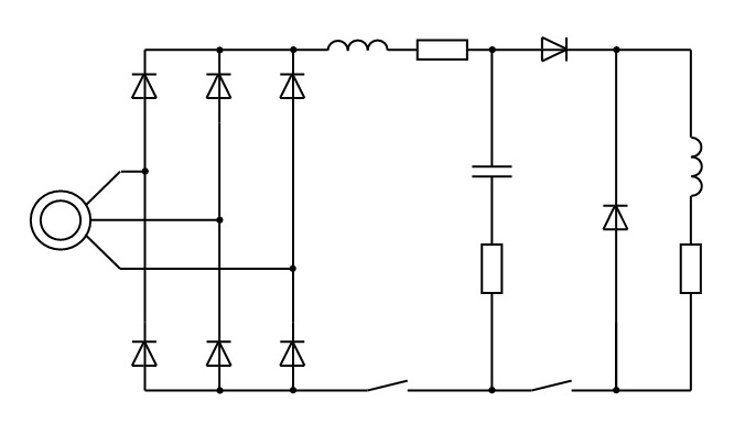 Экспериментальная установка состоит из: трехфазного синхронного генератора СГ ПНТ-45, трехфазного неуправляемого выпрямителя, собранного на диодах VD1–VD6 типа ВЧ2-160-10, токоограничивающего реактора (индуктивностью LТР и активным сопротивлением RТР), промежуточного емкостного накопителя ЕН (емкостью СЕН и активным сопротивлением RЕН), индуктивного накопителя (индуктивностью LИН и активным сопротивлением RИН), диода VD7, не допускающего разряд индуктивного накопителя на промежуточный ЕН, диода VD8, обеспечивающего контур протекания тока ИН при заряде промежуточного ЕН и полупроводниковых ключей К1 и К2, условно представленных на рисунке замыкающими контактами.