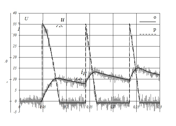 – осциллограммы токов и напряжений на промежуточном емкостном накопителе и индуктивном накопителе при заряде индуктивного накопителя до установившегося режима (рис. 2, 3);