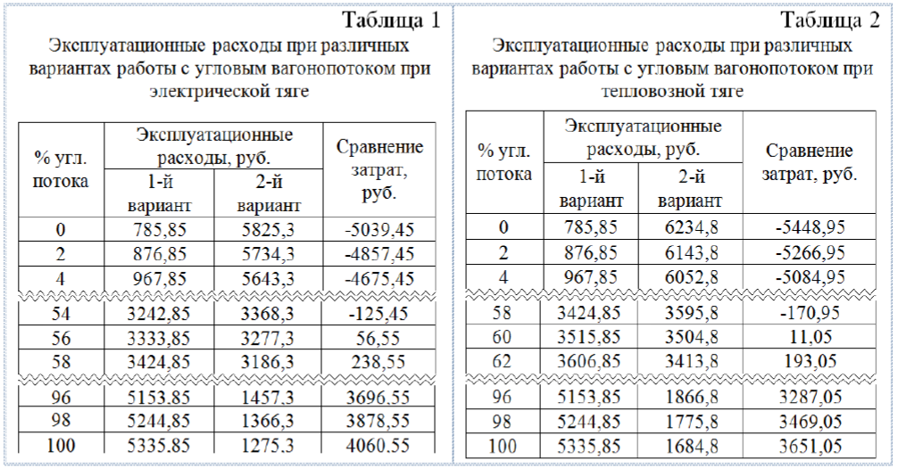 Сопоставлением эксплуатационных расходов по 1-му и 2-му вариантам установлено, при каких долях вагонов углового потока в составе будет целесообразно применять тот или иной вариант работы с ним. При этом исследовано влияние вида тяги. Результаты расчётов при электрической и тепловозной тяге представлены в таблицах 1 и 2.