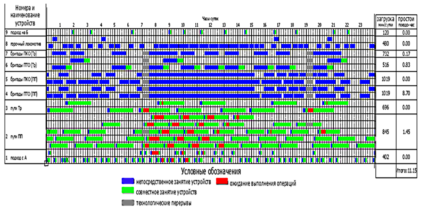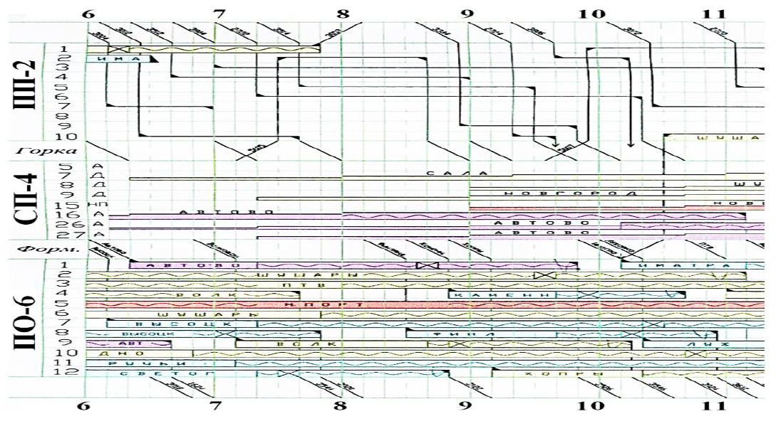 Рис. 6. Фрагмент суточного плана-графика работы сортировочной системы с использованием диспетчерского приёма