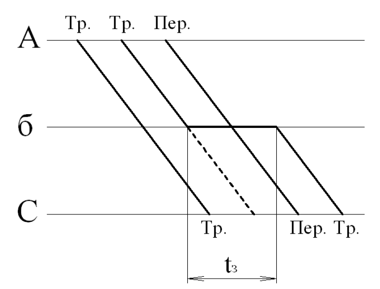 На фрагменте графика движения поездов со станции А в сторону сортировочной станции С друг за другом следуют два транзитных поезда (Тр.) и один в переработку (Пер.) с межпоездным интервалом (в расчётах принят равным 10 мин). Для того чтобы к станции С поезда прибыли чередуясь, второй транзитный поезд поставлен под обгон поездом в переработку.