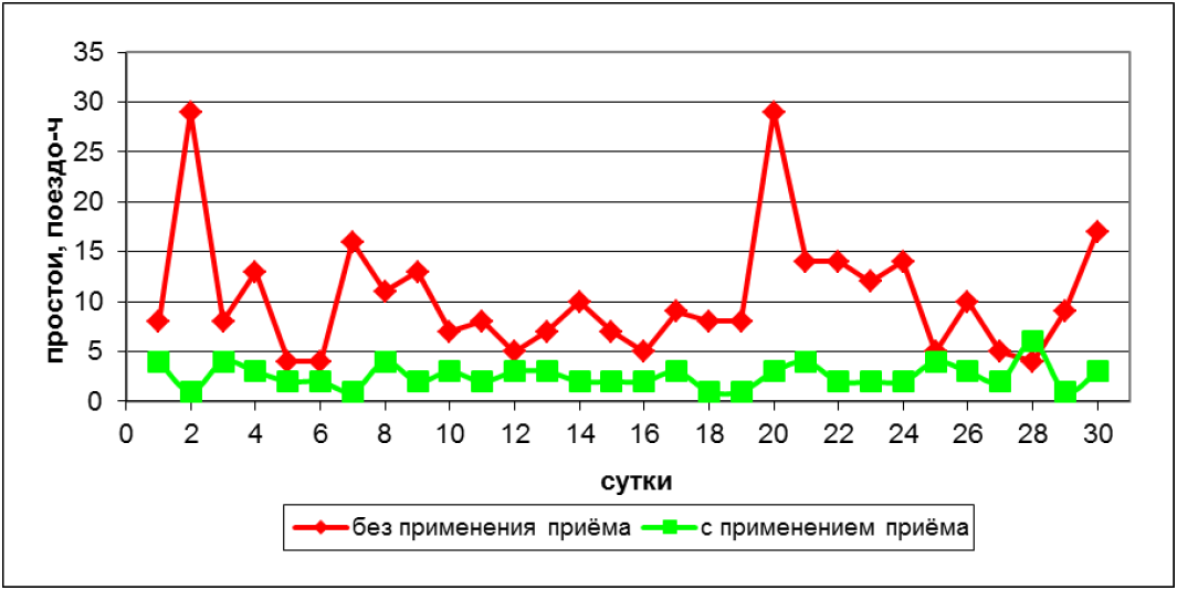 Из рис. 7 видно, что в 28-е сутки межоперационные простои без использования приёма несколько ниже, чем с его применением. Вызвано это увеличением простоев в ожидании приёма, при отсутствии свободных путей.