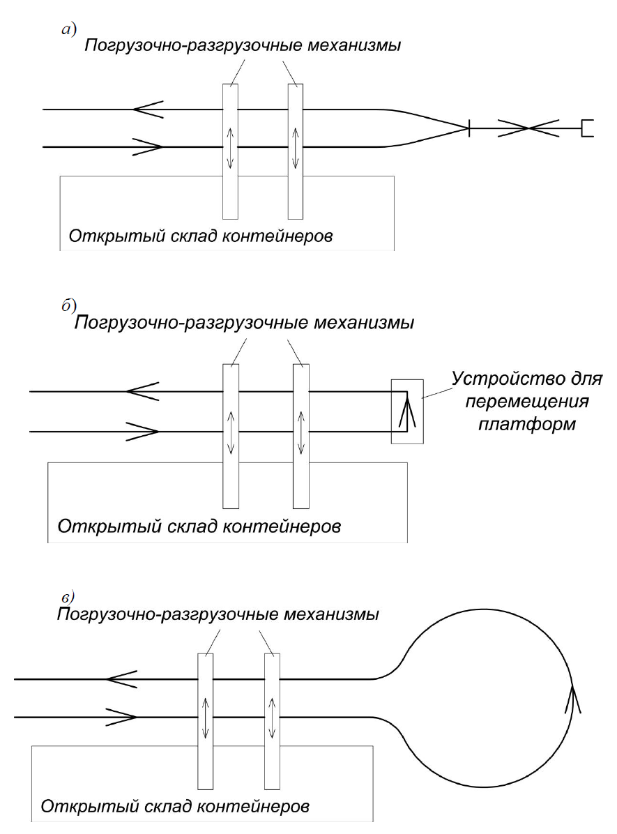 При существующем состоянии вопроса развития грузового магнитолевитационного транспорта, логичным будет заключение, что первые грузовые станции и непосредственно места погрузки и выгрузки контейнеров будут проектироваться по схемам тупикового типа [8, 9, 10]. При этом главным требованием к схемам таких станций будет обеспечение поточности процесса переработки. Для этого операции по погрузке и выгрузке контейнеров целесообразно выполнять на разных путях, а переход с пути выгрузки на путь погрузки предусматривать с противоположной стороны по отношению к въезду на станцию. Можно предложить несколько принципиальных технологических схем осуществления грузовых операций (рис. 1).