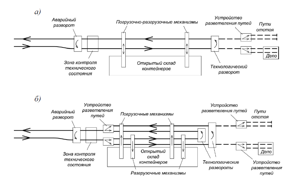 В первом варианте технология работы станции предполагается следующая. Платформы поступают с линии через зону автоматического технического контроля (рис. 2, а). На этом этапе выявляется необходимость проведения ремонтно-профилактических работ с подвижным составом. После осмотра платформы ставятся в очередь на выгрузочном пути и продвигаются к разгрузочным механизмам, позиционируясь в определённой точке (которая может меняться в зависимости от текущей ситуации на терминале) для снятия контейнера. Во время ожидания выгрузки должны быть автоматически открыты замки крепления контейнера. После снятия контейнера каждая платформа позиционируется на устройстве технологического разворота (трансбордере). Исключения составляют платформы, «забракованные» при осмотре или требующие планового сервисного обслуживания. Они проходят трансбордер насквозь, выводятся из цикла перевозки и направляются в депо. Бóльшая часть платформ с помощью трансбордера будет переставлена на погрузочный путь. При уменьшении размеров перевозок некоторые платформы с трансбордера съезжают в противоположную сторону, в отстой, а при увеличении – наоборот, выезжают с пути отстоя на погрузочный, проходя трансбордер насквозь.