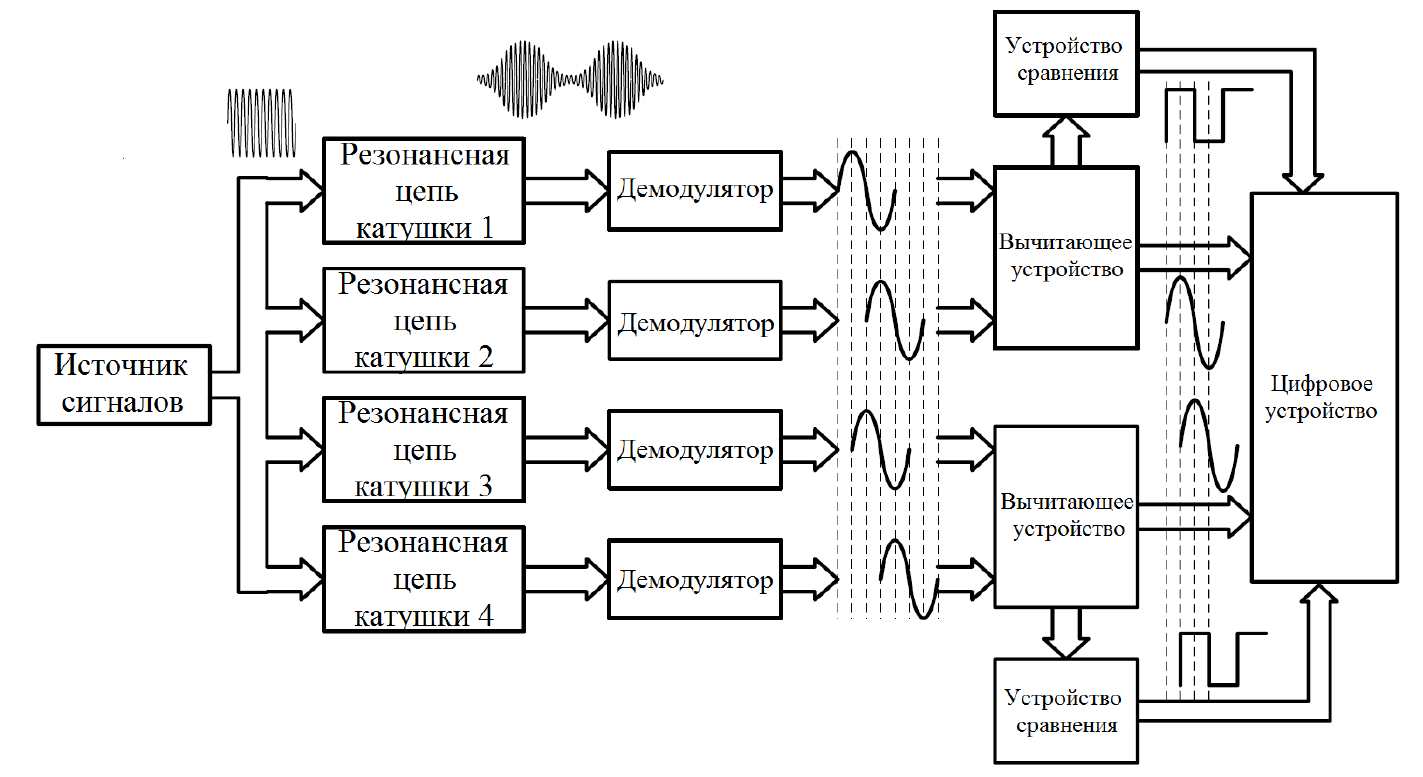 Согласно относительному расположению катушек в одной группе (рис. 5), сдвиг по фазе демодулированных сигналов будет составлять 180° (рис. 6). Демодулированные сигналы подаются на вычитающие устройства для получения разностного сигнала. Разностный сигнал обладает формой более близкой к синусоиде и позволяет исключить влияние изменения сопротивления под воздействием температуры. Согласно относительному расположению четырех катушек, сдвиг по фазе двух разностных сигналов будет составлять 90°. Синусоидальные разностные сигналы в устройствах сравнения преобразуются в прямоугольные сигналы. Количество зубцовых делений, пройденных экипажем, получается на основании подсчета количества пиков прямоугольного сигнала. Направление движения экипажа определяется по фазовому сдвигу между двумя прямоугольными сигналами.