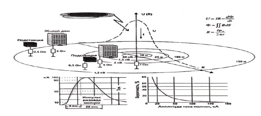 Грозовые разряды являются самым мощным источником импульсных воздействий на аппаратуру ТПС. Напряжение молнии может составлять до ста миллионов вольт. В нормах строительства «громоотводов» принимают обычно ток молнии до 200 кА при длительности порядка 1 мс, хотя практически ток молнии редко превышает 20-30 кА. Температура канала при главном разряде может превышать 25000°C. Длина канала молнии – от 1 до 10 км, диаметр – несколько см. При ударе молнии в молниеотвод электрический ток (в виде импульса колоколообразной формы, рис. 2) поступает в землю и растекается в грунте во все стороны до сотен метров, причем из-за сопротивления грунта этот ток создает на нём падение напряжения. Поскольку наибольшее сопротивление оказывают слои почвы, лежащие вблизи места вхождения тока в землю, то именно здесь наблюдается самое высокое напряжение. По мере удаления от этой точки сопротивление прохождению тока уменьшается, при этом снижается и напряжение.