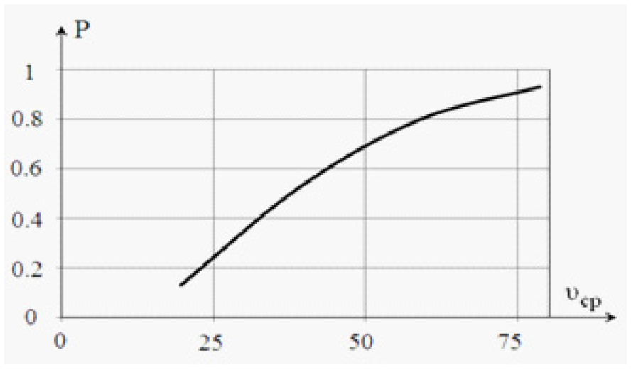 По предложенной методике была получена зависимость вероятности сбоя P от концентрации частиц пыли на контактных поверхностях vc (количества частиц пыли на 1 мм2 контактной поверхности). Сбой фиксировался по величине переходного сопротивления. Если переходное сопротивление превышало номинальное значение в два и более раз, то условно фиксировался сбой. Расчеты выполнялись методом статистических испытаний. При этом случайными величинами принимались диаметры частиц пыли, координаты расположения пылинок и высоты микровыступов. Результаты расчета приведены на рис.1.