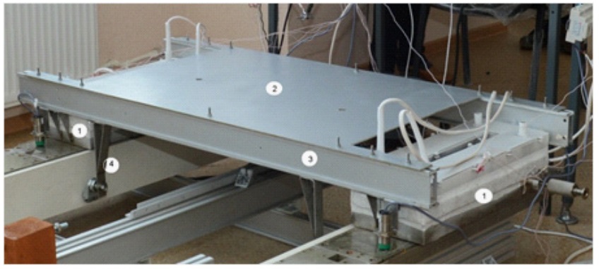 Рис. 1. Внешний вид ВТСП-2 модуля: 1 – азотные криостаты, 2 – текстолитовая пластина, 3 – алюминиевый профиль, 4 – ролики подвижной механической структуры
