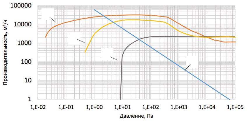 На рис. 3 представлено сравнение «производительности» отверстия диаметром 1,05 мм и производительности известных моделей вакуумных установок (2 – насос НВЗ-500, 3 - вакуумная установка УВП 5000/600, 4 – трехступенчатая вакуумная насосная установка ET3S).