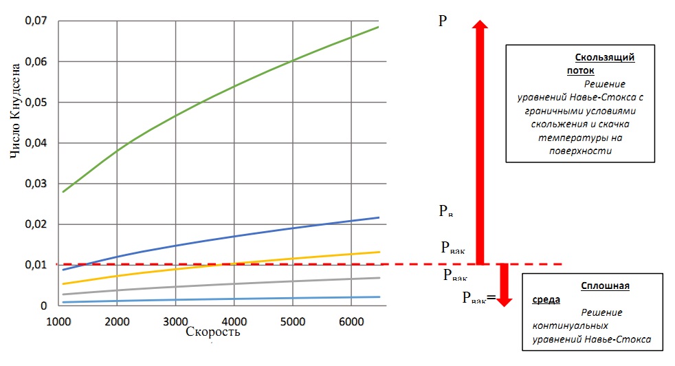 На рис. 9 представлены оценки числа Кнудсена для рассматриваемой геометрии капсулы, в диапазоне скоростей полета V=1000 ÷ 6500 км/ч, давлений Pвак=1÷1000 Па.
