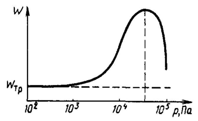 Рис. 6. Типичная зависимость мощности от давления потребляемой высоковакуумным двухроторным насосом [6]