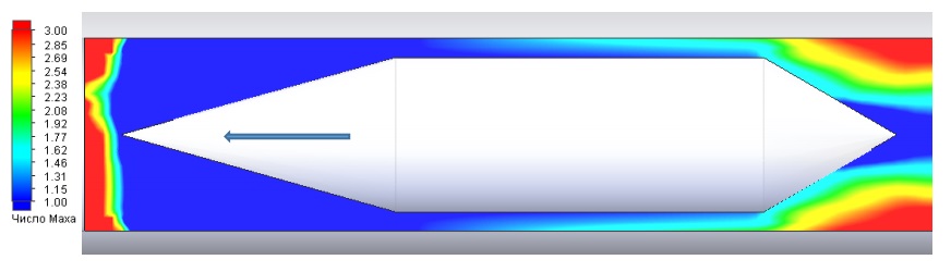 Изучая аэродинамические характеристики капсулы, нельзя рассматривать её отдельно от канала, игнорируя вопросы интерференции. Полет тела в свободном потоке и в условиях ограниченных стенками канала в общем случае не идентичны. Картина обтекания капсулы в свободном полете со сверхзвуковой скоростью (V=6500 км/ч, число М=5.4, Р=100 Па, Т=300 К) представлена на рис. 11.