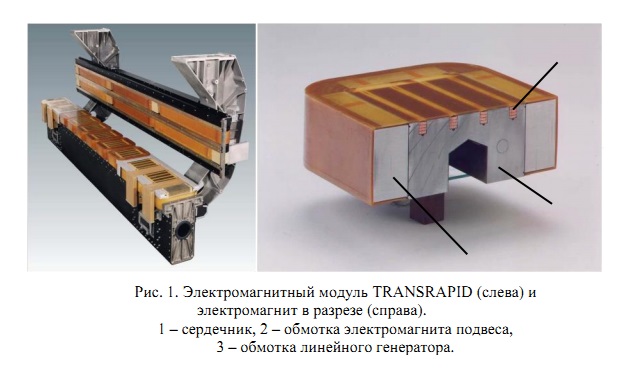 Рис. 1. Электромагнитный модуль TRANSRAPID (слева) и электромагнит в разрезе (справа). 1 – сердечник, 2 – обмотка электромагнита подвеса, 3 – обмотка линейного генератора.
