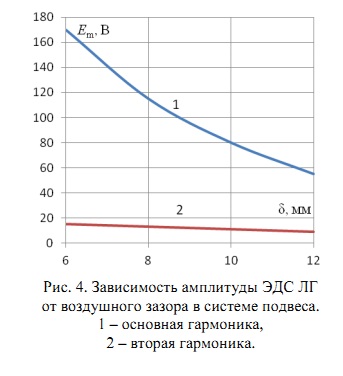 Анализ показывает [10], что амплитуда ЭДС ЛГ практически не зависит от тока статора ЛСД и характеризуется весьма малым содержанием высших гармоник (наиболее выражена вторая гармоника). При скорости 80 км/ч суммарная ЭДС десяти центральных магнитов ЛГ одного электромагнитного модуля экипажа TRANSRAPID достигает 450 В. Ток возбуждения ЛСД влияет на ЭДС ЛГ существенно: с ростом тока возбуждения ЛСД растет амплитуда основной гармоники ЭДС ЛГ. (рис. 3). Кроме этого, существенное влияние на амплитуду основной гармоники ЭДС ЛГ оказывает величина воздушного зазора (рис. 4).