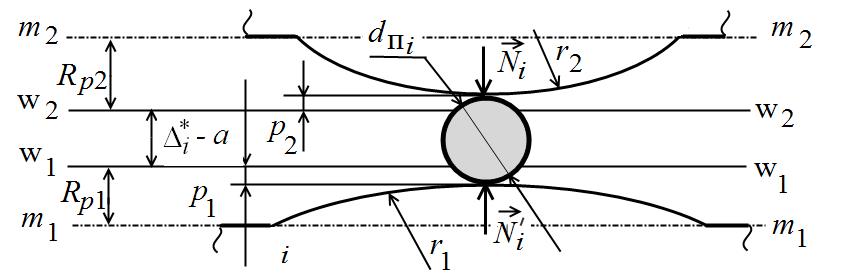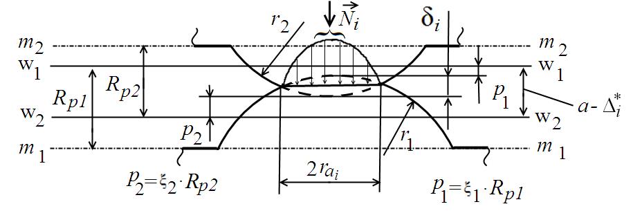 где Δ0i - начальный зазор между выступами; δ1iосн, - перемещения взаимодействующих выступов как жестких целых из-за деформации упругих оснований; а - сближение поверхностей вершин.