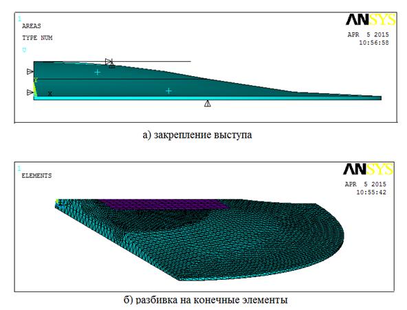 Для определения остаточных деформаций выступов, были проведены расчетные исследования методом конечных элементов в системе ANSYS. Задача взаимодействия двух одинаковых выступов одинакового радиуса является симметричной, поэтому рассматривалось взаимодействие четверти выступа с жесткой плоскостью. На рис. 4 показано закрепление поверхностей микровыступа и его разбивка на конечные элементы.