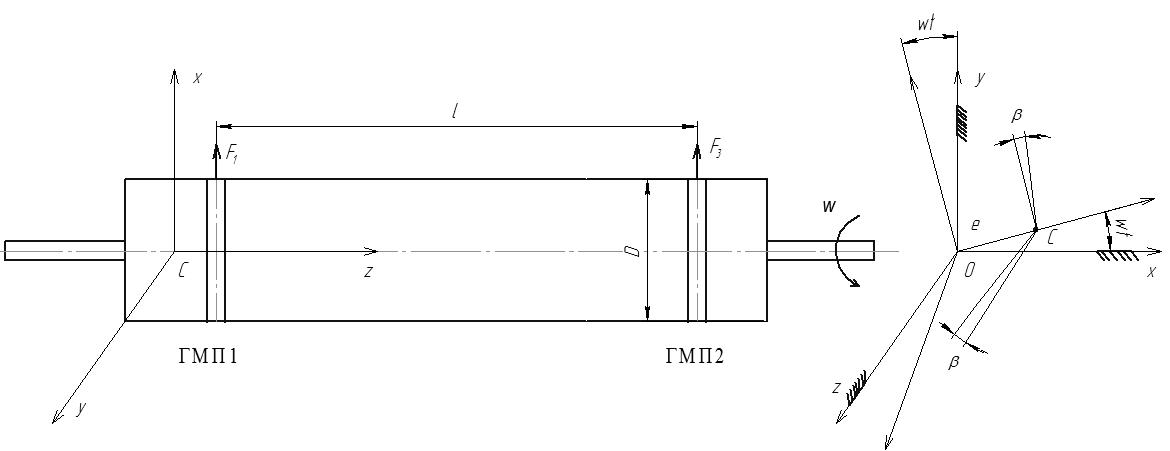 При разработке обобщенной математической модели, описывающей высокооборотные ЭМПЭ на БПО, рассматривается жесткий, недеформируемый ротор на упругих подшипниковых опорах (в качестве упругих подшипниковых опор могут выступать активные магнитные подшипники, газовые подшипники, гибридные магнитные подшипник), при этом ротор массой mр установлен на двух опорах (рисунок 1). Статическая неуравновешенность массы ротора характеризуется эксцентриситетом e, динамическая – угловым параметром .