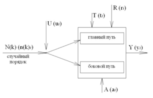 N(k) (n(k)i ) – входящий поток поездов, состоящий из k категорий (пассажирские поезда, грузовые поезда и т.п.), который характеризуется неравномерностью внутри года, месяца, недели и суток; T(ti ) – продолжительность операций, производимых с входным потоком поездов; R(ri ) – ресурсы раздельного пункта; Y(yi ) – отклики модели; A (ai ) – случайный компонент в технологии работы раздельного пункта; U (ui ) – управляющее воздействие.