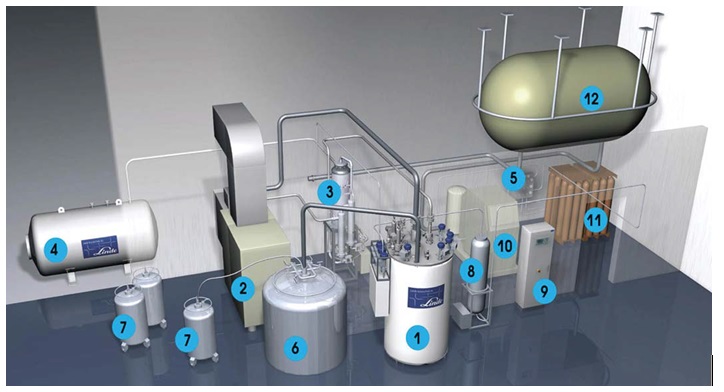 3. Fig. 2. Schematic diagram of the production of liquid helium 1 - Liquefier; 2 - Compressor; 3 - Oil separator; 4 - Receiver; 5 - Pressure controller; 6.7 - Dewar; 8 - Dehumidifier; 9 -Main controller; 10 - booster compressor; 11 - Ramp with cylinders; 12 - Soft helium gas tank