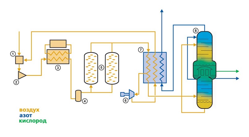 Рис. 3. Принципиальная схема получения жидкого азота 1 - Вход в воздушный фильтр; 2 - Воздушный компрессор; 3 - Система охлаждения; 4 - Сепаратор воздух/вода; 5 - Система очистки воздуха; 6 - Турбодетандер; 7 - Главный теплообменник; 8 - Колона дистилляции