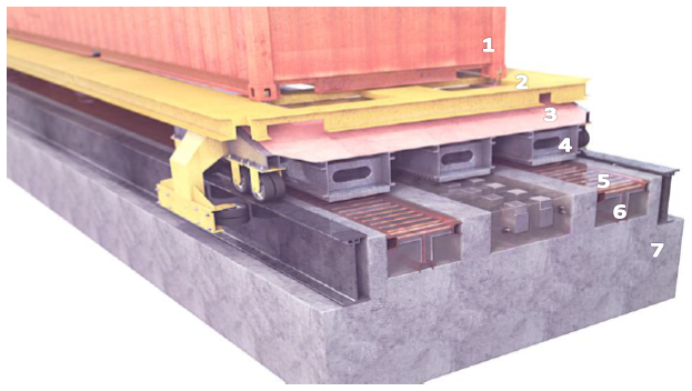Рис. 1. Основные элементы магнитолевитационной системы для транспортных коридоров: 1 – контейнер; 2 – фитинговая рама; 3 – модельная несущая тележка; 4 – магнитный полюс; 5 – трек левитации; 6 – трек стабилизации; 7 – путевая структура