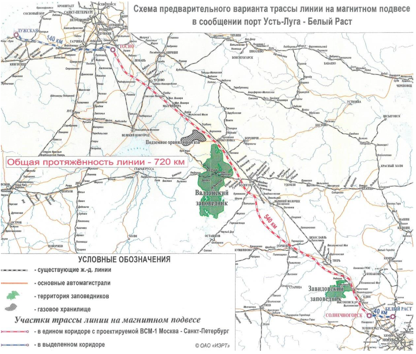 Для более детального рассмотрения экономической целесообразности создания транспортных коридоров на магнитолевитационной технологии в ПГУПС разработано технико-экономическое обоснование магистрали от портов Финского залива (Санкт-Петербург) до грузовых терминалов Москвы. Линия рассматривается как головной участок межконтинентальной системы Север – Юг, Восток – Запад по территории России.