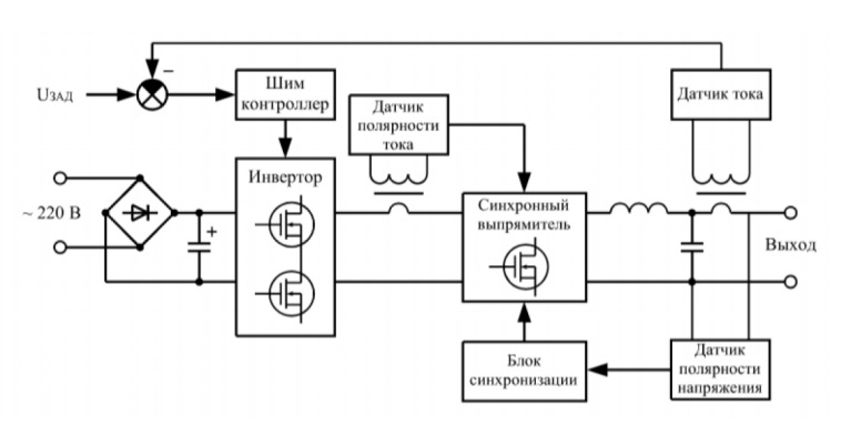 Силовая цепь источника содержит следующие основные узлы: сетевой выпрямитель с накопительным конденсатором, двухступенчатый инвертор, синхронный выпрямитель, выходной LC-фильтр. Управление работой инвертора осуществляется ШИМ-контроллером, а синхронный выпрямитель управляется блоком синхронизации. Для реализации алгоритма управления используется сигнал отрицательной обратной связи по току, а также сигналы с датчиков полярности тока инвертора и выходного напряжения источника.